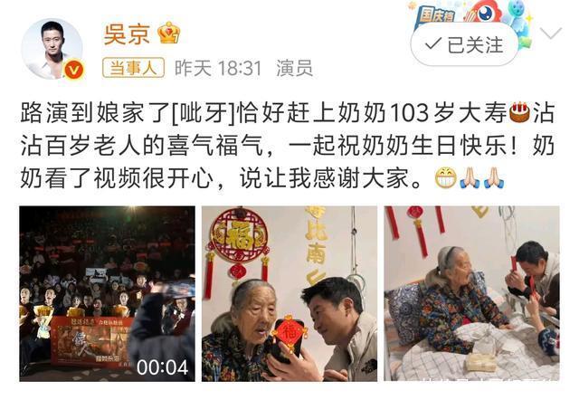 吴京新电影《镖人》可以说是口碑票房双丰收,目前已经突破9.39亿,而且看了大家的影评也是一致的好。 影片还在上映,吴京的路演也还在继续,新的一站路演到娘家,吴京和谢楠又刚好赶上了奶奶103岁大寿,这真的是双喜临门。于是吴京录了个视频祝奶奶生日快乐,老人家看了很是开心。 电影团队的小伙伴们全部蹲在一块喊祝福语,大家一起沾沾奶奶的福气。 吴京把拍好的视频给奶奶看,百岁奶奶看了很开心,年纪大了但是看起来依旧健硕,吴京把手机拿得很近,奶奶才能看得到听得到。 然后吴京和谢楠还一起拿着红包给奶奶拜年沾喜气福气,这是谢楠的奶奶,但也是吴京的奶奶,看到就是接到,屏幕前的大家也一起接这份好福气。